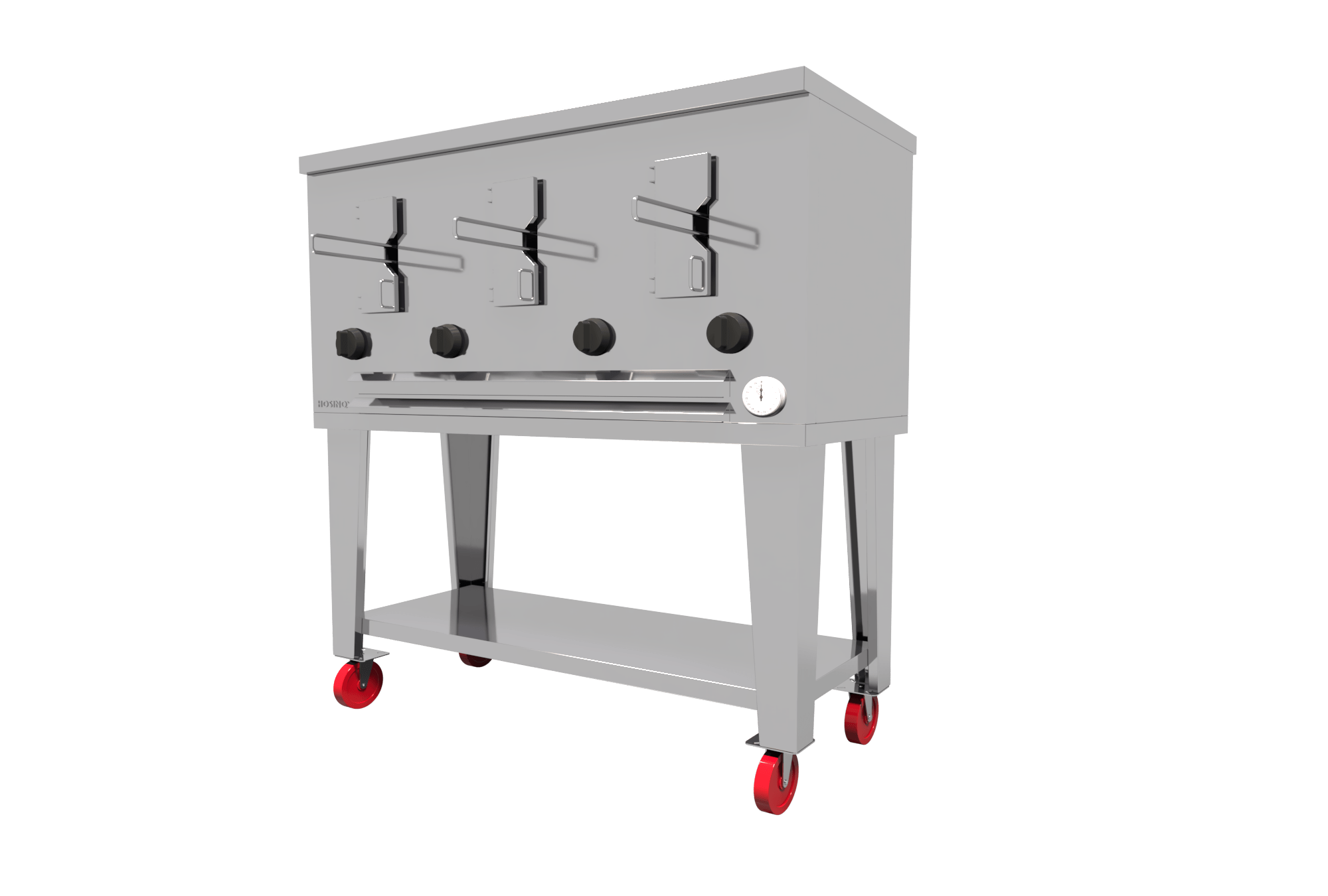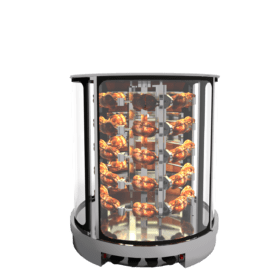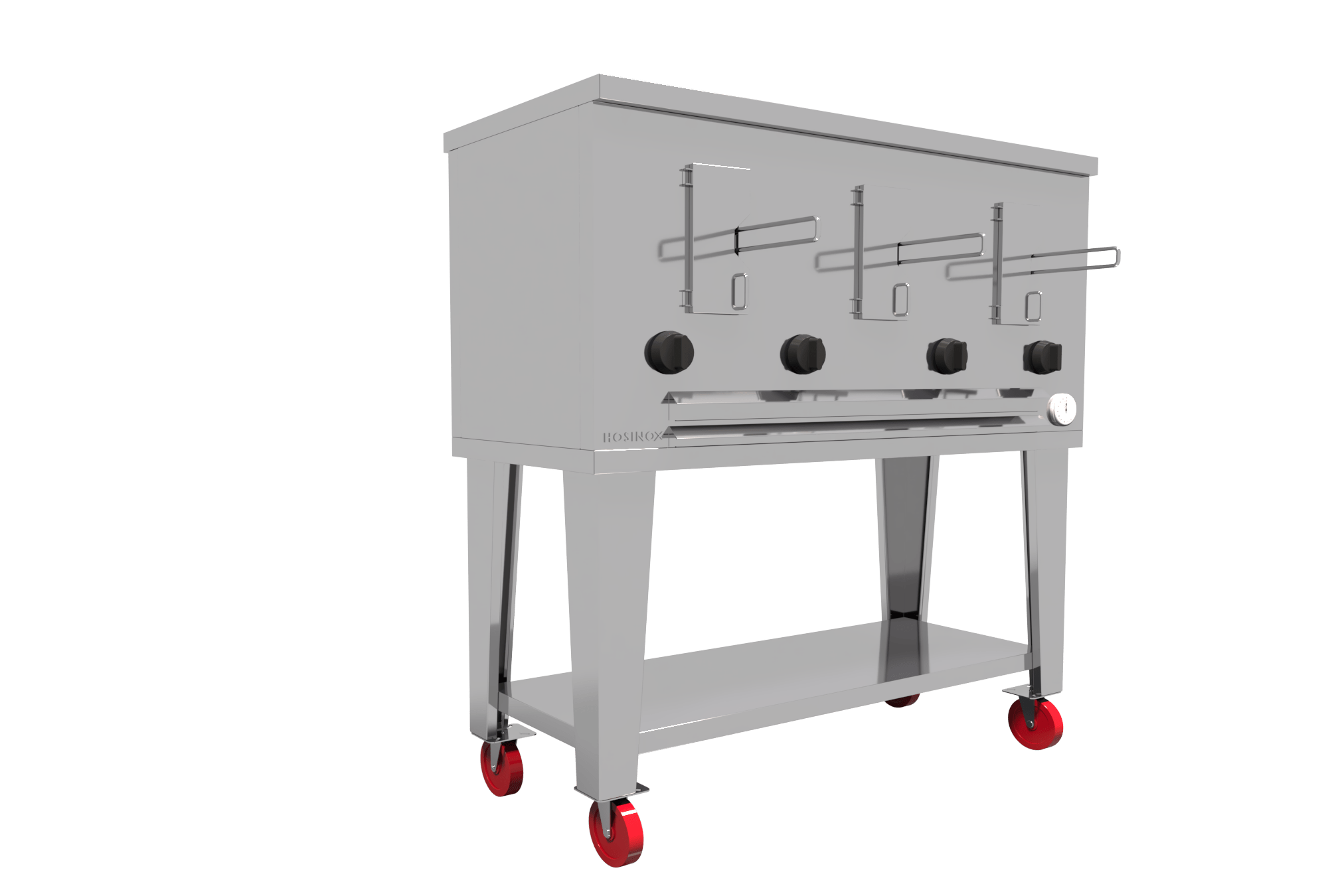 قاعدة شواية الدجاج هي هيكل دعم متحرك مصمم لحمل وتشغيل أسياخ الشواء لشواء الدجاج. وهي مصنوعة من الفولاذ المقاوم للصدأ المتين، ومجهزة بشعلات (تعمل بالغاز أو الفحم)، وعجلات لسهولة الحركة. يتيح تصميمها تحميصًا فعالًا، وتنظيفًا سهلًا، وتعاملًا آمنًا في المطابخ التجارية والمطاعم.